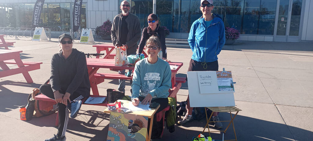 October 11th turned out to be a great day for a trot … warm, sunny and beautiful fall colours (far superior to the following snowy, cold day!). We had 21 registrants (12 of whom were runners) for the Calgary Trot, held near St. Patrick’s Island. Just the sweetest group of trotters you could hope for! Everyone stayed and cheered on each of the runners as they crossed the finish line. We had people stopping to chat and find out what we were doing and why we were saving turkeys!