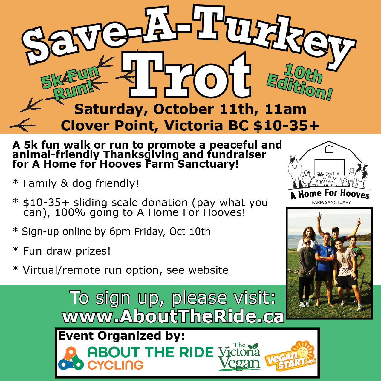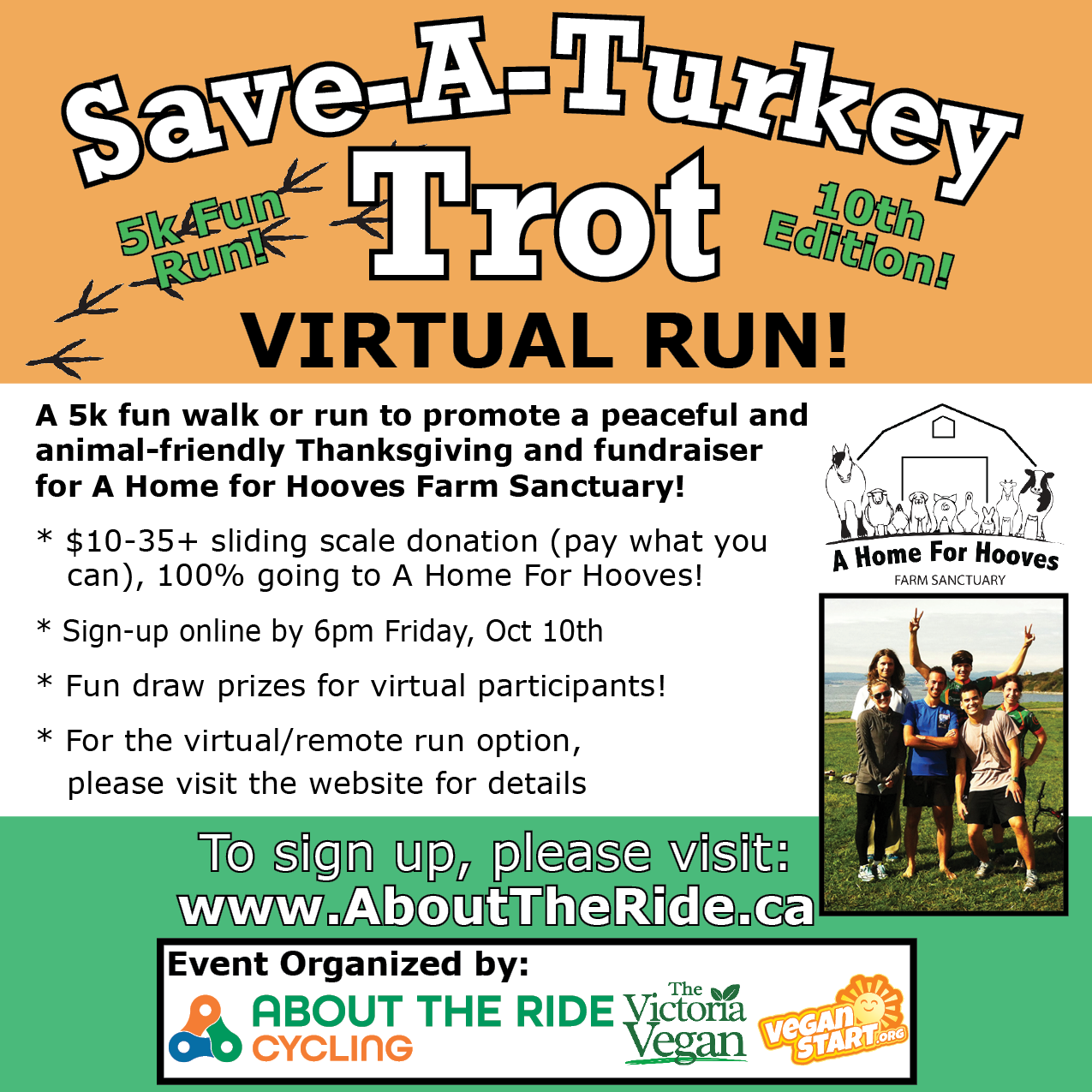 Join us for a fun 5k run/trot/stroll to promote a peaceful, animal-friendly Thanksgiving and fundraiser with all funds going to A Home for Hooves Farm Sanctuary near Duncan, BC! We raised nearly $1200 in 2023 (see blog post here), and hope to raise even more this year! Also check out our co-host The Victoria Vegan for local vegan resources, including a comprehensive Vegan Venue Guide to Victoria and the Island!